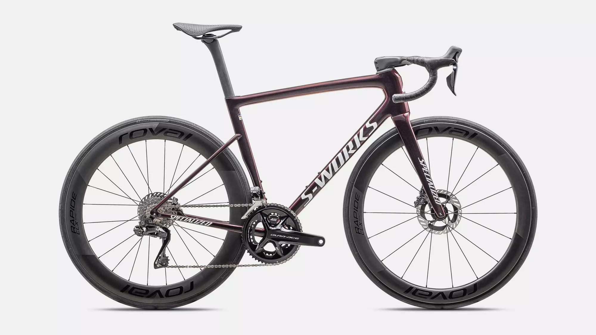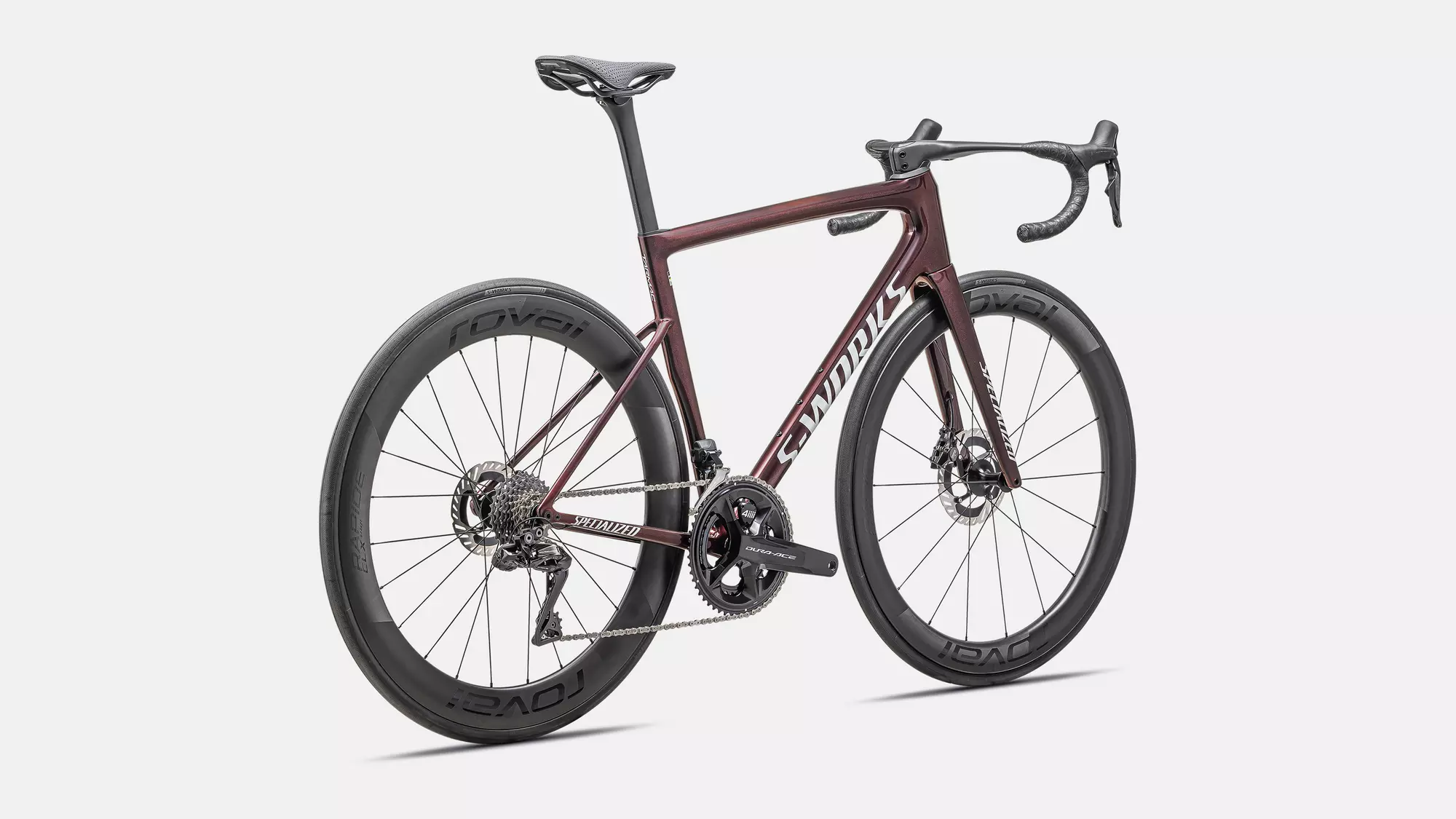 La S-Works Tarmac SL8 monta los mejores componentes. Viene con un grupo completo Shimano Dura-Ace 9200 Di2 con potenciómetro de doble cara y un juego de ruedas Roval Rapide CLX II (tubeless-ready), compatibles con tubeless, que complementan a la perfección el cuadro más rápido del mundo. Todos los modelos S-Works Tarmac SL8 llevan, además, un cockpit Roval Rapide, diseñado para reducir el peso y ofrecer el borde de ataque más aerodinámico posible.